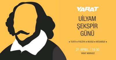 Aprelin 21-də “YARAT” Müasir İncəsənət Mərkəzində görkəmli ingilis şairi və dramaturqu Uilyam Şekspirin yaradıcılığına həsr edilmiş tədbir keçiriləcək.
