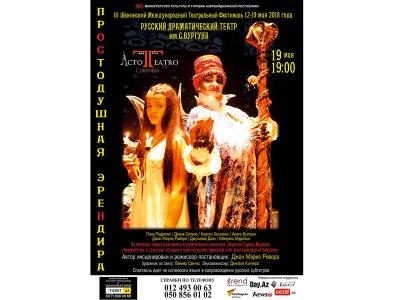 Студия актеров из Колумбии Acto Teatro представит вниманию зрителей спектакль "Простодушная Эрендира" по мотивам повести колумбийского писателя Габриэля Гарсиа Маркеса "Невероятная и грустная история о простодушной Эрендире и ее жестокосердной бабушке". Спектакль будет представлен в 19.00 19 мая.