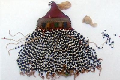 Украшения для одежды ручной работы изготовлены из шелковой ткани розового и синего цвета в форме треугольника, расшитой мелкими фрагментами цветной ткани, металлическими элементами, а также декоративными элементами – гюлебетин и бафта.