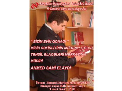 В рамках проекта Дома культуры имени Г.Сарабского "Bizim evin qonaqları" ("Гости нашего дома") состоится встреча с директором Египетского центра связей в области культуры и образования, атташе по вопросам культуры посольства Египта в Азербайджане Ахмедом Сами Элайди, сообщили в пресс-службе Главного управления культуры и туризма города Баку.