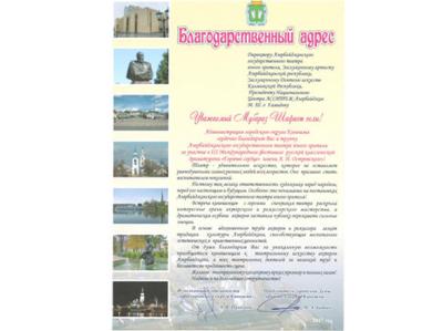 В письме отмечено, что администрация городского округа Кинешма сердечно благодарит директора театра, заслуженного артиста Азербайджана, президента Азербайджанского национального центра ASSİTEJ (Международная ассоциация театров для детей и молодежи) Мубариза Гамидова и труппу театра за участие в III Международном фестивале русской классической драматургии "Горячее сердце".
