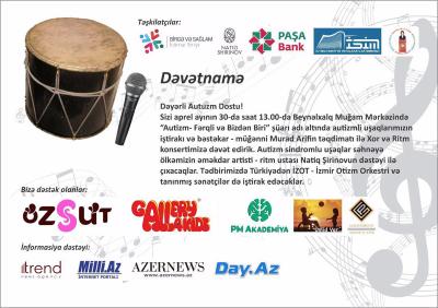 Впервые дети с аутизмом выступят в хоре и в ансамбле исполнителей на нагаре. Художественный руководитель концерта – заслуженный артист Натиг Ширинов. Ведущий вечера – певец, композитор и телеведущий Мурад Ариф.