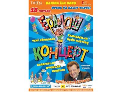 Впервые в Баку, 18 ноября, в Азербайджанском академическом театре оперы и балета пройдет «Ералаш-концерт». Гостей праздничного вечера ждет интерактивная встреча с основателем «Ералаша» Борисом Грачевским, яркое шоу, веселые шутки, приятные сюрпризы, игры со зрителем, забавные истории о съемках киножурнала, показ новых серий киножурнала, бесплатные фотографии с героями мультфильмов в фойе (более 30 ростовых кукол).