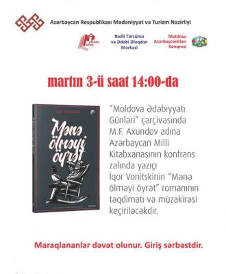 Azərbaycan Yazıçılar Birliyi Bədii Tərcümə və Ədəbi Əlaqələr Mərkəzinin təşkilatçılığı, Mədəniyyət və Turizm Nazirliyinin dəstəyi, Moldova Azərbaycanlıları Konqresinin iştirakı ilə martın 1-dən 3-dək Bakıda Moldova ədəbiyyatı günləri keçiriləcək.