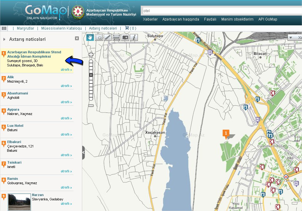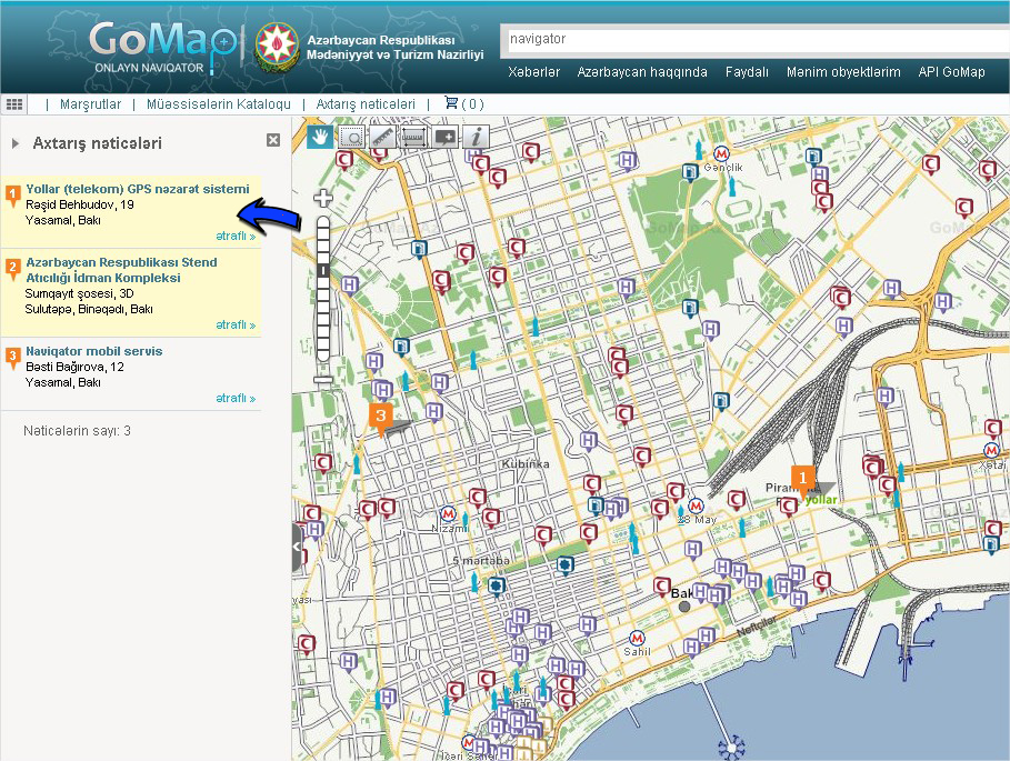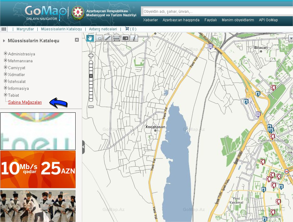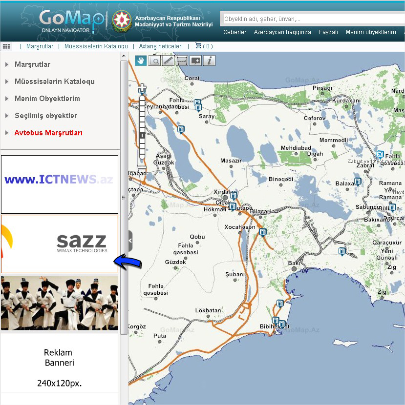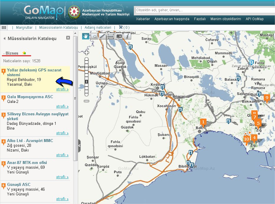 In case of choise of certain category (type) in catalog, in left menu advertised object is presented on the top of the list on a yellow background. (Regardless of whether the object is in the visible part of the map's browser window).