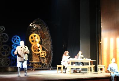 Ayhan Aydoğanın səhnə tərtibatı da əsərin fəlsəfi-psixoloji missiyasını gözəl şəkildə tamamlayır. Səhnədəki böyük beyin maketi, onun açılmasından sonra ortaya çıxan zaman məfhumu və fələyin çarxını xatırladan orijinal üslub yüksək peşəkarlıq nümunəsidir.