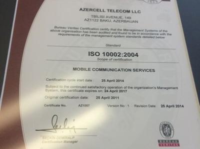 ISO (Международная Организация по Стандартизации) является всемирной федерацией национальных организаций по стандартизации (организации-члены ISO). По сегодняшний день данная федерация установила стандарты в сфере управления, технологий, а также товарных знаков, услуг и положительного опыта. В 2011 году, пройдя успешно аудит на сертификацию, Azercell Telecom получил Стандарт соответствия ISO 10002:2004. 14 марта текущего года Компания вновь успешно прошла сертификацию и обновила сертификат соответствия. Сертификат, выданный на основе аудита компании Bureau Veritas, действителен с 25 апреля 2014 года по 24 апреля 2017 года. Сертификат вновь подтвердил тот факт, что Azercell Telecom является компанией, функционирующей и развивающейся в соответствии с высокими стандартами.