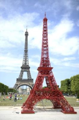 «Младшая сестра» знаменитого творения Гюстава Эйфеля возведена из 324 садовых стульев красного цвета. По словам инициаторов акции, проект, помимо своеобразного «подарка» к юбилею, также является демонстрацией находчивости французских промышленников.
