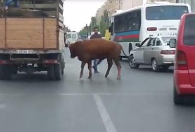 Belə ki, işıqforda gözləyərkən “QazEl” markalı kiçik yük maşınında kəsilməyə aparılan öküz qəfil qaçmağa müvəffəq olub. Lakin avtomobilin sürücüsü cəld tərpənərək “QazEl”i sola çəkməklə öküzü yaxınlıqdakı ağ 10 PS 523 dövlət nömrə nişanlı ağ “Hyundai”a tərəf sıxa bilib, ardınca da tez-tələsik kəndirlə tutub. Lakin öküz bundan sonra daha da qızışıb və “Hyundai”a zərbələr vurub, onu əzib.