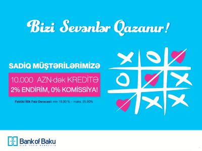 "Sizə Yaxın Bankçılıq" şüarına sadiq qalan, müştərilərinə dəyər verən "Bank of Baku" 21 avqust - 15 sentyabr tarixlərində yalnız sadiq müştəriləri üçün "Bizi sevənlər qazanır!" adlı yeni kredit kampaniyasına start verir.