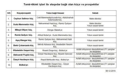 Nəqliyyat Nazirliyi Nəqliyyatı İntellektual İdarəetmə Mərkəzi təmir-tikinti işləri ilə əlaqədar hazırda bağlı olan küçə və prospektlərin siyahısını açıqlayıb.