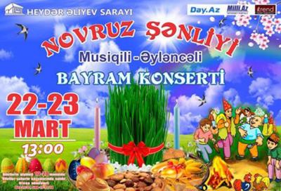 Sarayın mətbuat xidmətindən bildirilib ki, Novruz bayramı münasibətilə martın 22-23-də sarayın səhnəsində möhtəşəm bayram konserti keçiriləcək. Hər il olduğu kimi, Novruzun sevilən personajları Kosa və Keçəl, Bahar qız şənliyin əsas simaları olacaqlar. Sevimli qəhrəmanlar uşaqlara Novruz bayramı, baharın gəlişi, çərşənbələr və digər adət-ənənələr haqda məlumat verəcək, müxtəlif oyunlar keçirəcəklər.