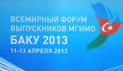 2013-cü il. Bakıda Moskva Dövlət Beynəlxalq Münasibətlər İnstitutu məzunlarının I Ümumdünya Forumu keçirilib. “Birlikdə gələcəyə doğru” devizi altında təşkil olunmuş forumda Rusiya, Ukrayna, Macarıstan, Çexiya, Bolqarıstan, Moldova, Polşa, Slovakiya, Kuba, Koreya Respublikası, İsrail, Qazaxıstan, Qırğızıstan, Çin, Vyetnam və s. ölkələrdən rəsmi şəxslər, nüfuzlu beynəlxalq təşkilatların, maliyyə və biznesin 500-dən çox nümayəndəsi, o çümlədən institutun məzunu olan Azərbaycan Prezidenti İlham Əliyev iştirak edib.