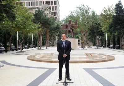 iştirak edib. Prezident abidənin üzərindəki örtüyü götürüb, önünə gül