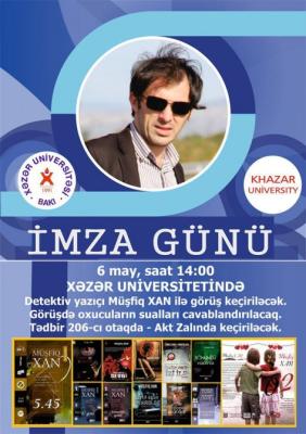 Mayın 6-da Xəzər Universitetində gənc detektiv yazıçı Müşfiq XAN ilə görüş və yazıçının kitablarının “imza günü” keçiriləcək.