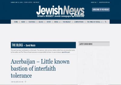 Britaniyada yəhudi icmasının ən böyük qəzeti sayılan “Jewish News”un internet səhifəsində Azərbaycanda hökm sürən yüksək səviyyəli dini tolerantlıq və multikultural mühit haqqında məqalə dərc edilib.