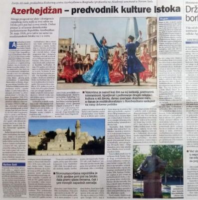 Serbiyanın geniş oxucu kütləsinə malik gündəlik “Danas” qəzetində Azərbaycanın Belqraddakı Mədəniyyət Mərkəzinin direktoru, Novi Sad şəhərinin İncəsənət Akademiyasının professoru Zərifə Əlizadənin “Azərbaycan – Şərqin mədəniyyət flaqmanı” adlı məqaləsi nəşr olunub.