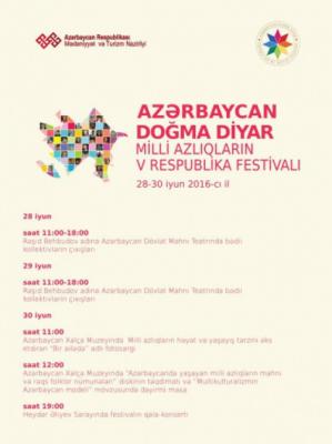 Nazirliyin informasiya və ictimaiyyətlə əlaqələr şöbəsindən bildirilib ki, görülən işlərin davamı olaraq iyunun 28-dən 30-dək Bakı şəhərində “Azərbaycan – doğma diyar” devizi altında Milli Azlıqların V Respublika Festivalının keçirilməsi nəzərdə tutulur.