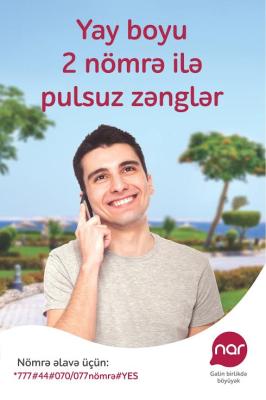 Qeyd edək ki, kampaniyadan istifadə üçün aylıq ödəniş 2.5 AZN təşkil edir. Seçilmiş nömrənin aktivləşdirilməsi isə 0.40 AZN-dir. İkinci nömrənin qoşulması pulsuzdur. Kampaniyaya qoşulmayan “Nar” nömrələr və digər operatorların nömrələri ilə səsli/görüntülü zənglərin bir dəqiqəsinin qiyməti cari tarif əsasında hesablanır.