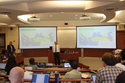 Azərbaycanın ABŞ-dakı səfirliyindən verilən məlumata görə, əksəriyyətinin təhsil ilə yanaşı işgüzar fəaliyyətlə də məşğul olduğu auditoriyada əsas məruzəçi qismində çıxış edən səfir dünyada qədim neft diyarı kimi tanınmış Azərbaycanın enerji siyasətinin tarixindən və qlobal enerji bazarının inkişafına verdiyi töhfələrdən danışıb. O vurğulayıb ki, Azərbaycanın iqtisadi siyasətinin öncül istiqamətlərindən olan və müəllifi Azərbaycan xalqının ümummilli lideri Heydər Əliyev olan neft strategiyamızın həyata keçirilməsinə 1994-cü ildə dünyanın aparıcı enerji şirkətləri ilə "Əsrin Müqaviləsi"nin imzalanması ilə başlanıb. Səfir bu tarixi hadisə ilə Azərbaycanın ilk dəfə olaraq, Xəzər dənizini və onun enerji ehtiyatlarını dünyanın üzünə açdığını qeyd edib.