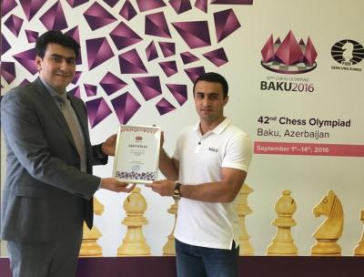 Turnirin mətbuat xidmətindən verilən məlumata görə, idmançıya xüsusi sertifikatı Bakı Şahmat Olimpiadası Əməliyyat Komitəsinin icraçı direktoru Murad İskəndərli təqdim edib.