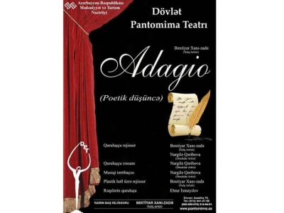 “Adajio” müasir Azərbaycan şairlərinin lirikası üzərində qurulmuş ədəbi-musiqili, sözlü-pantomimalı kompozisiyadır. “Adajio” poetik düşüncəsi bir şəhər parkında vaqe olur. Parkda altı gənc qız heykəli növbəli şəkildə canlanaraq buradan təsadüfən (bütün təsadüflər zərurətdən doğur prinsipi) keçən və ya bilərəkdən buraya baş çəkən keçmiş sevgililəri ilə birlikdə eşq hekayətlərini danışırlar. Şair tamaşanın əvvəlində öz düşüncələrini bölüşür, sonda isə harmonik müdaxilələrini edir. Bütün bunlar əksəriyyəti Avropa, bir hissəsi Azərbaycan musiqisi olmaqla seçmə kompozisiya və rəqslər ilə müşayiət edilir. Adajio tempində qurulan tamaşanın finalı alleqro ruhunda vüsalla əlamətdardır.