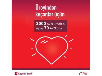 Kapital Bank müştərilərə “Ürəyindən keçənlər üçün” adlı yeni aksiya təqdim edir. Bankdan verilən məlumata görə, şərtlərə görə ayda cəmi 79 manat ödəməklə, 2000 manat nağd pul krediti almaq olar. Kreditin müddəti 40 ay təşkil edir.