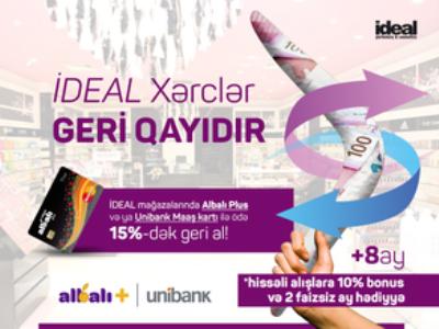 Avqustun 10-na qədər "İdeal" mağazalarında "Unibank" ASC-nin "Albalı Plus" debet və əmək haqqı kartları ilə alış-veriş edənlər xərclədikləri vəsaitin 15%-ni geri alacaqlar. Bu barədə Bankdan bildirilib.