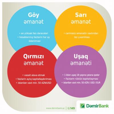 DəmirBank müştərilərin tələblərinə uyğun, “Əmanət çeşidi” programı üzrə əhaliyə “Göy”, “Sarı”, “Qırmızı”,“Uşaq” əmanət növlərini təklif edir.