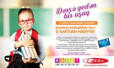 İstənilən məktəb ləvazimatlarına 25% bonus verilir. Həmin bonuslarla “RAHAT” marketlərdən yenidən bazarlıq edə bilərsiniz. Ətraflı məlumat üçün *5551 qaynar xəttinə zəng edə və ya “RAHAT” marketin facebook səhifəsinə yaza bilərsiniz.