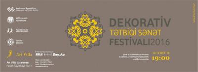 Oktyabrın 12-dən “Art Villa” qalereyasında Dekorativ-Tətbiqi Sənət Festivalı-2016 başlanacaq. Festival Azərbaycan Respublikasının Prezidenti yanında Gənclər Fondunun maliyyə dəstəyi və “Arts Council Azerbaijan” tərəfindən təşkil ediləcək. Layihənin kuratoru Səbinə Nəcəfovadır.