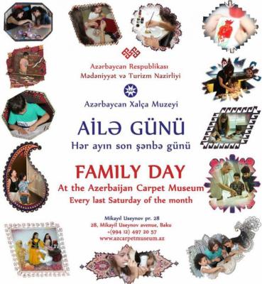 Azərbaycan Xalça Muzeyində “Ailə günü” tədbirinin hər ayın son şənbəsi “Açıq qapı” günü çərçivəsində saat 11:00-dan 19:00-dək keçirilməsi nəzərdə tutulur.