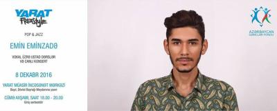 Dekabrın 8-də “YARAT” Müasir İncəsənət Mərkəzində gənc vokalçı Emin Eminzadə tərəfindən pop və caz vokal janrının təbliğinə həsr olunmuş ustad dərsləri keçiriləcək.