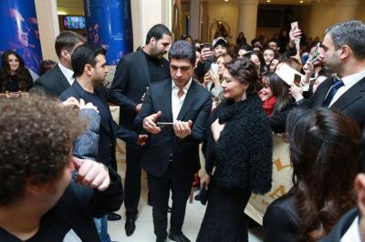 Pərəstişkarların coşqulu alqışları ilə qarşılanan artistlər tamaşaçılarla birlikdə filmi izləyiblər.