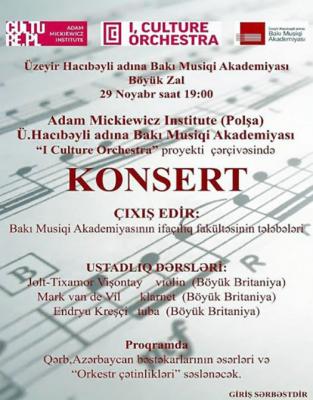 Akademiyadan bildirilib ki, ustad dərsləri polşalı professorlar Jolt Tixamor Vişontay (violin) Mark Van de Vil (klarnet) və Endryu Kreşçinin (tuba) iştirakı ilə baş tutub. İki gün davam edəcək ustad dərsləri Polşanın Adam Mitskeviç İnstitutu tərəfindən həyata keçirilən “CULTURE ORCHESTRA” layihəsi çərçivəsində gerçəkləşib.
