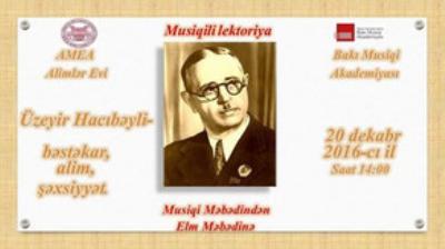 “Üzeyir Hacıbəyli – görkəmli bəstəkar, alim, şəxsiyyət” adlı ilk musiqili lektoriya dekabrın 20-də AMEA-nın Alimlər Evində keçiriləcək. Mühazirəçi Bakı Musiqi Akademiyasının professoru Ceyran Mahmudovadır.