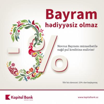 Kapital Bank проводит льготную кредитную кампанию по случаю праздника Новруз. Согласно условиям до 31 марта клиентам предоставляется возможность получить кредит со скидкой 3 процентов на годовую процентную ставку, сообщили в банке.