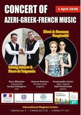 Aprelin 1-də Beynəlxalq Muğam Mərkəzində Azərbaycan, Fransız və Yunan ifaçıları birgə konsert proqramı ilə çıxış edəcəklər.