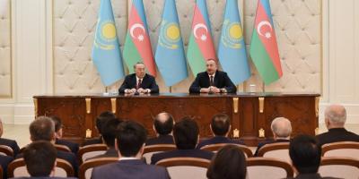 Azərbaycan-Qazaxıstan sənədlərinin imzalanmasından sonra Prezident İlham Əliyev və Prezident Nursultan Nazarbayev mətbuata bəyanatlarla çıxış ediblər.