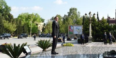 Prezident İlham Əliyev xalqımızın ümummilli lideri Heydər Əliyevin Yevlax şəhərinin mərkəzində ucaldılmış abidəsini ziyarət edərək önünə gül dəstəsi qoyub.