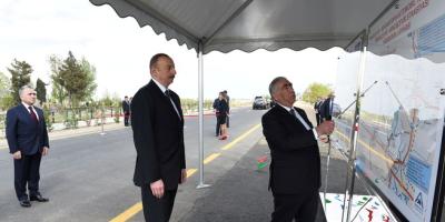 Prezident İlham Əliyev yolun rəmzi açılışını bildirən lenti kəsdi.
