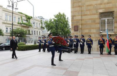Dövlət başçısı abidənin önünə əklil qoyub.