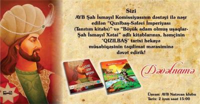02 iyun saat 15:00-da AYB Natəvən klubunda Şah İsmayıl Komissiyasının dəstəyi ilə çap edilən “Böyük adam olmuş uşaq - Şah İsmayıl Xətai” və “Azərbaycan Səfəvi-Qızılbaş imperiyası”nın tanıtım kitabının təqdimatı və Şah İsmayıl Xətainin adının əbədiləşdirilməsi üçün keçiriləcək Hekayə müsabiqəsinin təqdimatı keçiriləcək.