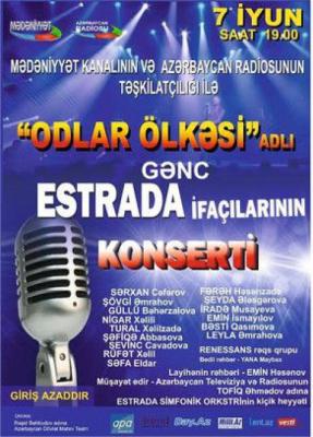 İyunun 7-də R.Behbudov adına Dövlət Mahnı Teatrında gənc estrada ifaçılarının “Odlar ölkəsi” adlı konserti keçirilib.
