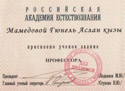 AMЕA Naхçıvan Bölməsinin Təbii Ehtiyatlar İnstitutunun Sorbsiya prosesləri laboratoriyasının rəhbəri, kimya üzrə fəlsəfə doktoru, dosent Günel Məmmədova Rusiya Federasiyasının Təbiətşünaslıq Akademiyasının professoru seçilib.