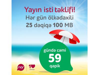 “Nar” yeni “yay kampaniyası”nı təqdim edib. Kampaniyaya gündə cəmi 59 qəpik ödəməklə ölkədaxili bütün istiqamətlərdə zənglər üçün 25 dəqiqə və 100 Mb internet trafiki daxildir.