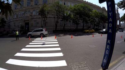 Piyadaların yolun hərəkət hissəsində diqqətli olmaları üçün xəbərdaredici məlumatlar yazılıb. Paytaxtımızda xarici turistlərin olduğunu nəzərə alaraq, bu məlumatlar ingilis dilində də qeyd edilib. Hərəkətin təhlükəsizliyi nəzərə alınaraq, svetafor dirəklərində də 3 dildə (azərbaycan, rus və ingilis) xəbərdaredici məlumat lövhələri quraşdırılıb.