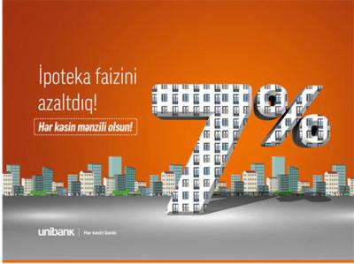 "Unibank" ipoteka kreditlərinin faizini aşağı saldı. İndi "Unibank"a müraciət edənlər dövlət ipoteka kreditlərini illik cəmi 7%-lə əldə edə biləcəklər.
