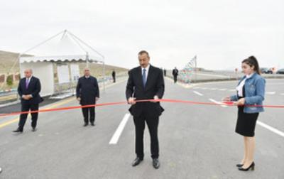 Dövlət başçısı yolun rəmzi açılışını bildirən lenti kəsib.