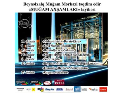 Beynəlxalq Muğam Mərkəzində “Muğam axşamları” layihəsinin yeni təqdimatı olacaq. 11 oktyabrdan başlayan və 27 dekabrda yekunlaşan layihədə “Mahur-hindi”, “Bayatı-Kürd”(11 oktyabr), “Orta Mahur”, “Rahab”(1 noyabr), “Bayatı-Qacar”, “Şahnaz”(15 noyabr), “Qatar”, “Dəşti”, “Mirzə Hüseyn Segahı”(29 noyabr), “Xaric Segah”(6 dekabr) muğamları, “Heyratı”, “Mənsuriyyə”, “Qarabağ şikəstəsi”, “Osmanlı”, “Heydəri”, “Simayi-Şəms”(13 dekabr), “Ovşarı”, “Arazbarı”(27 dekabr) kimi zərb muğamları səslənəcək.